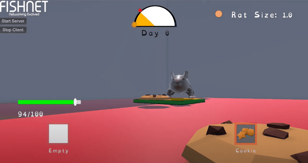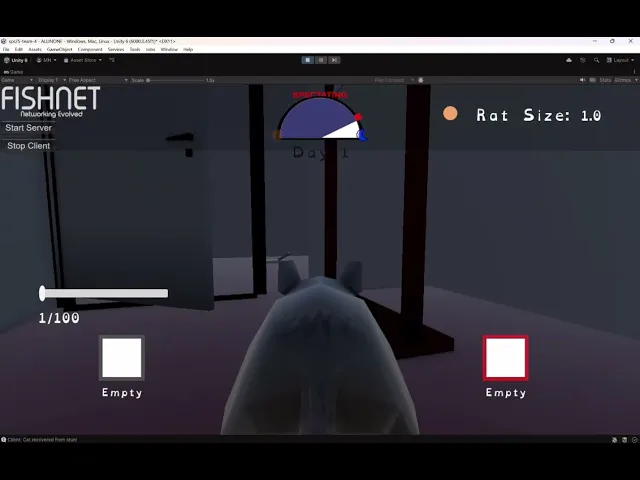 We integrated Fish-Networking (FishNet) to enable real-time multiplayer for 2-5 players. FishNet's client-server architecture allowed us to synchronize critical game state across all players, including movement, inventory interactions, item pickups, and the fat growth mechanic. We also implemented lobby and room creation systems so players could easily host or join sessions.